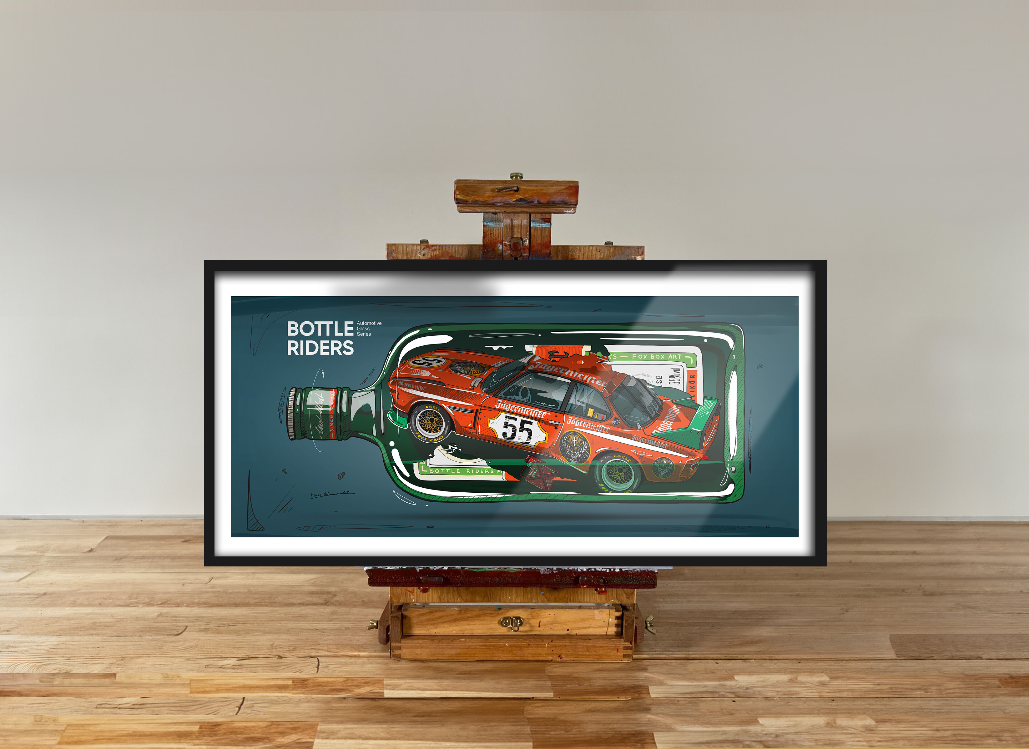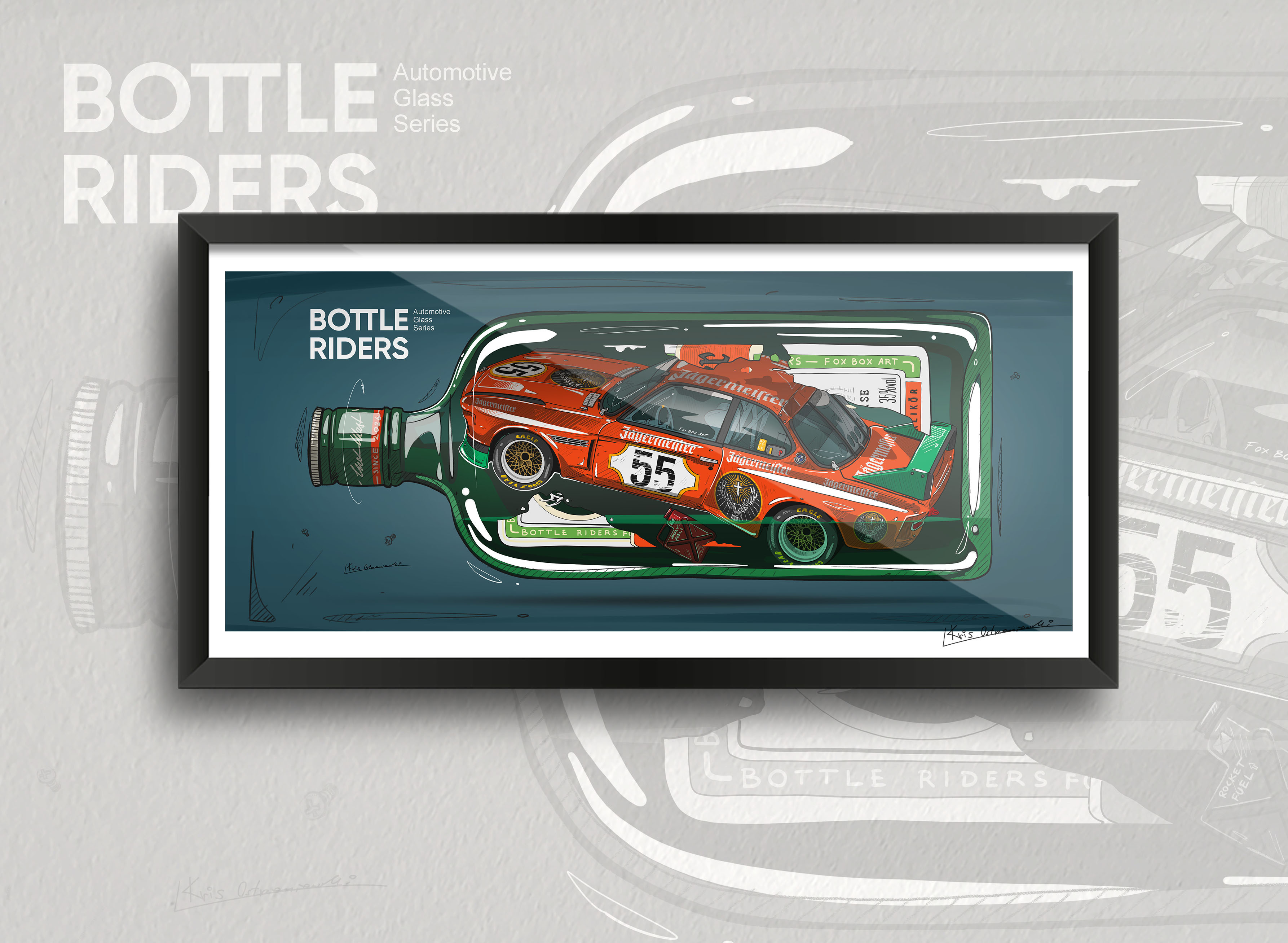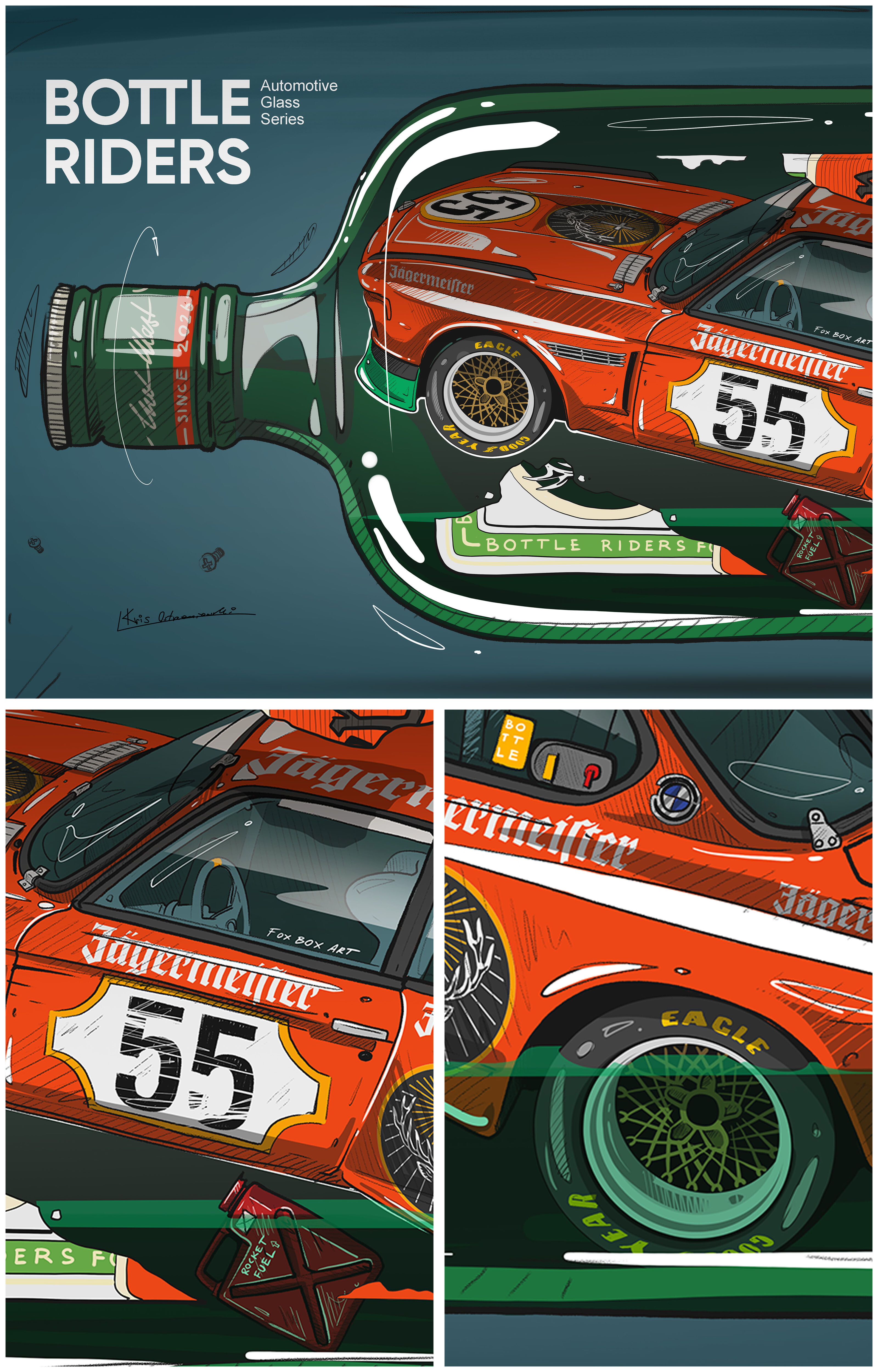 Autorskie ilustracje ikonicznych pojazdów zabutelkowanych w szklanych formach o popularnych kształtach, zamknięte jak w kapsule czasu - niczym modele statków. W butelkach spoczywają pojazdy z różnych epok. Szkło delikatnie zniekształca kontury, nadając im nostalgiczny, niemal oniryczny charakter. Każda praca to osobna historia - auto uwięzione w przestrzeni, zawieszone między wspomnieniem a marzeniem.